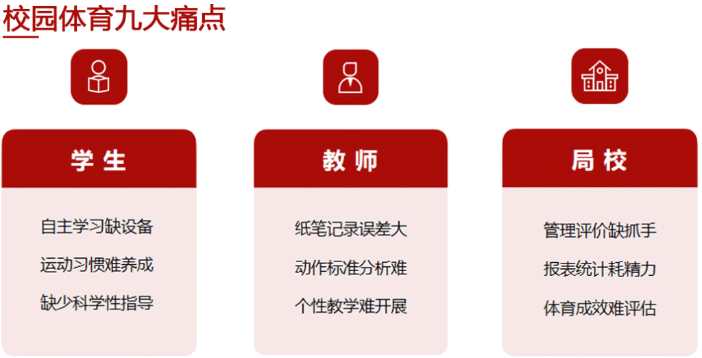 采用“云-边-端”网络架构,通过摄像头、一体化运动屏等智能终端,实时、多排度的采集学生运动数据。基于摄像头+A|运动视觉系统以及一体化交互终端,无需二次调试,无需佩戴设备,即可实现无感、智能化的锻炼、教学、评价一体化,覆盖引体向上、立定跳远、仰卧起坐、实心球、跳绳、中长跑等多项体育运动场景。