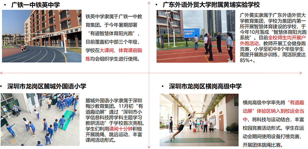 日前,学校初中学段2253名师生已参与阳光跑系统的使用,自应用以来,学生运动热情高涨,从试行系统首月1535人参与跑步到最高峰值2080人参与跑步,人均跑步距离人均跑步时长均有明显提升。